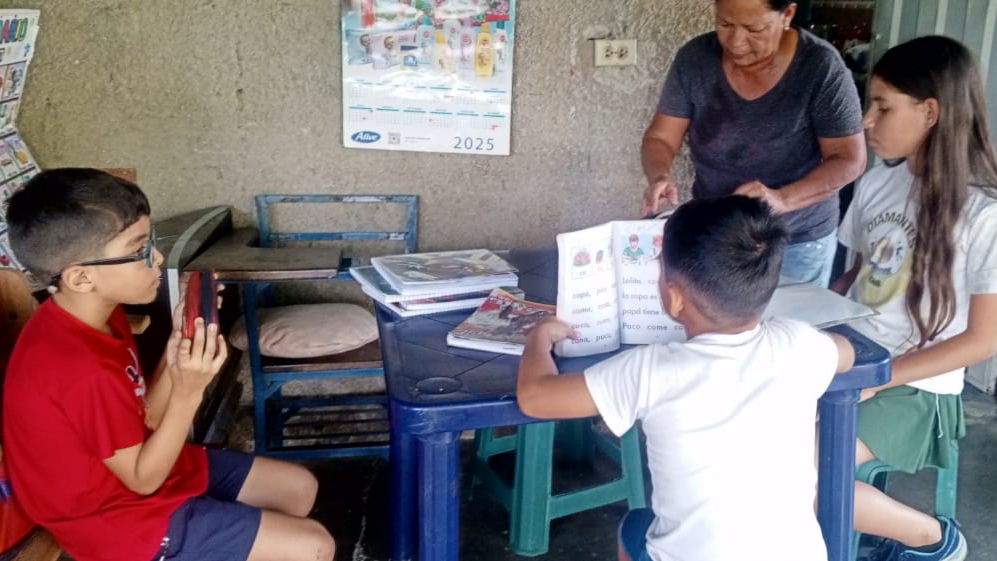 El aula refleja su espíritu: paredes humildes, materiales ordenados con esmero, afiches del abecedario y pilas de libros que invitan a la curiosidad. Los estudiantes llegan con sus cuadernos en mano; Jackeline revisa con detenimiento cada avance, formula preguntas y repite explicaciones hasta que todos comprendan los conceptos.